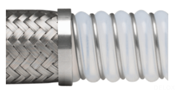 Convoflex?系列中型波紋PTFE管,外層聚丙烯編織網防護,食品制藥級,大流量設計,內部易于排水和清洗,耐強腐蝕,抗滲透性加強,可用于氯化物輸送和抽吸。適合把PTFE翻邊至接頭密封面,實現全PTFE流體接觸面,防止物料對PTFE以外物質的腐蝕風險。外層聚丙烯編織網比金屬編織網的耐腐蝕范圍更廣,熱傳導性更低,不傷手,不傷內部PTFE管。