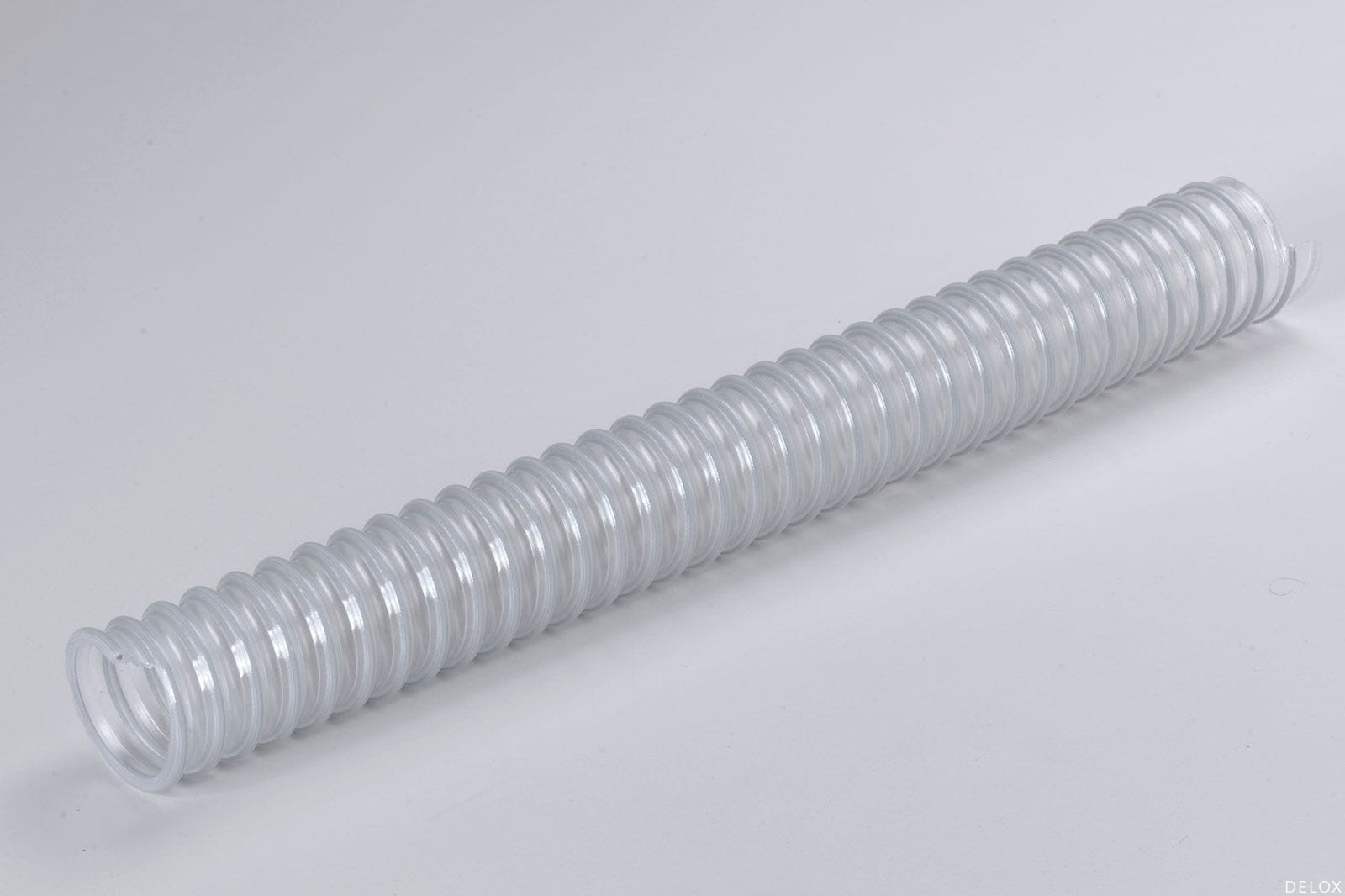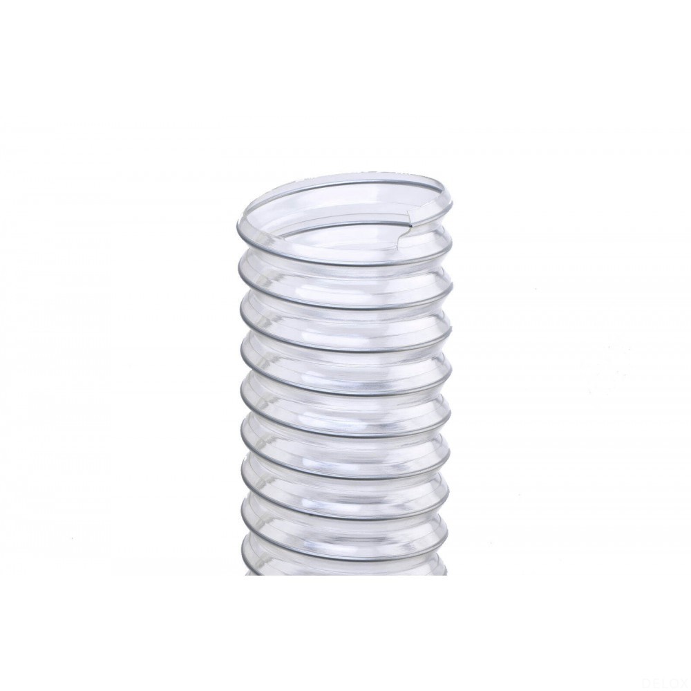 聚醚型聚氨酯材質,包塑鋼絲螺旋加強。非螺旋處壁厚恒定為1.5毫米。內壁平滑機械特性及真空性能卓越,柔韌,易彎曲,抗菌, 抗水解,抗老化,耐臭氧,耐紫外線,耐候性、耐多種化學品。不含鹵素,不含鄰苯二甲酸鹽。軟管兩端螺旋鋼絲接地可排靜電。